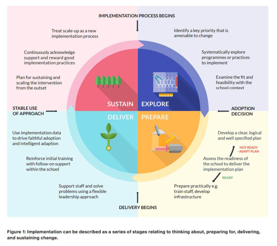 I am a huge fan of the EEF Implementation Guidance Report. Paraphrasing Jonathon Sharples, “it ain’t sexy” but it is invaluable when establishing an initiative within school. Therefore, using the cycle of implentation will give your initiative the best chance for success, identify potential pitfalls, and clarify what your actual aim is.