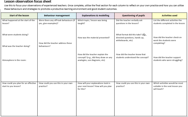 Utilising this framework along with a series of observation and reflection questions can support their progress (based on what they have seen an experienced teacher do, in a range of scenarios).