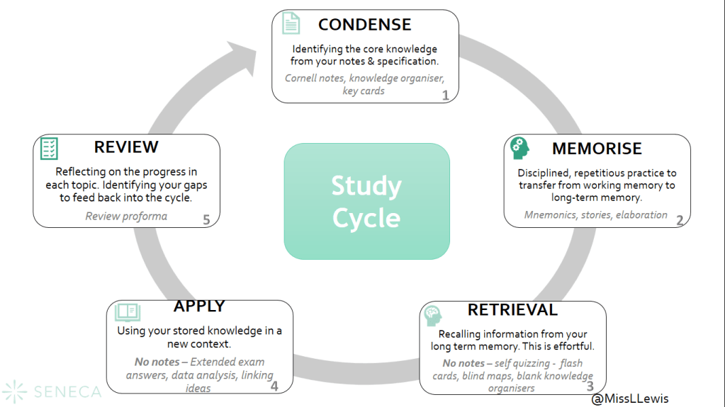 Alongside modelling the contents of our subject, it is also important to model the ‘how’ of studying. We, as teachers, are expert learners, therefore, we follow processes to lead to consolidation of any learning we undertake. Our students often lack this skill, despite huge efforts on their parts. To promote this we use a ‘study cycle’ to support their independent study and give them the best bets. I have blogged in more detail about how we utilise the study cycle here.