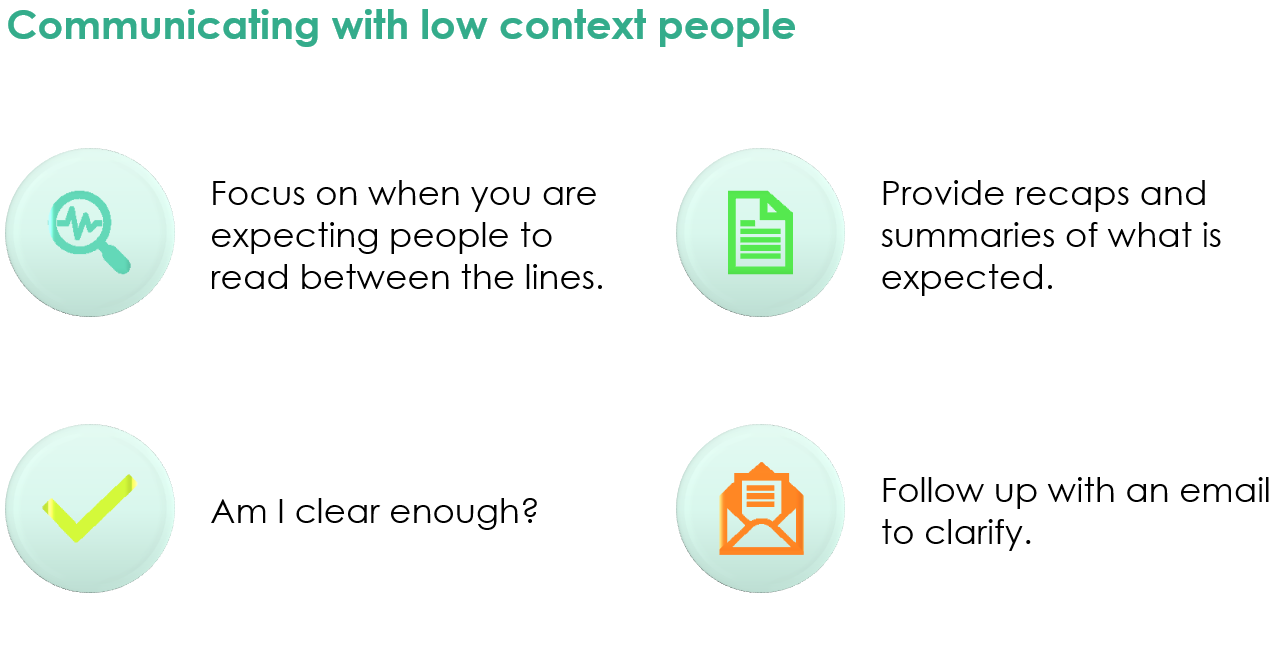 The fact that no two of us are exactly same, even if we belong to the same culture, means we will each have different contextual reference points, all of which could add to or seriously hinder communication. Therefore, understand the contextual ‘level (?) of your colleagues may be important if you find that you are struggling to communicate with one another. The book suggests the following strategies for communicating with people out of our context: